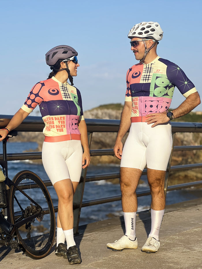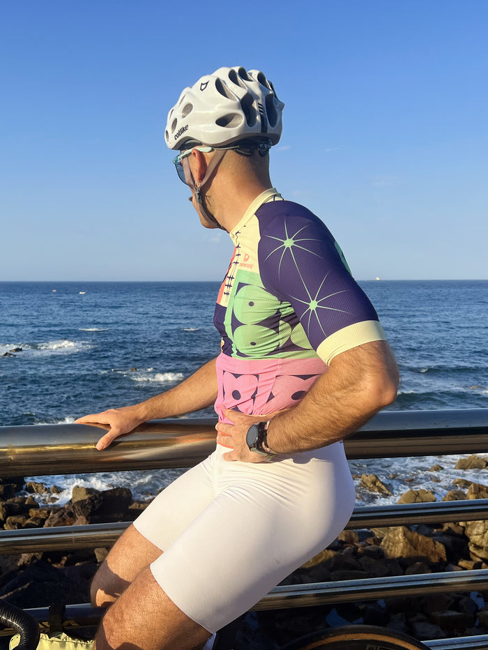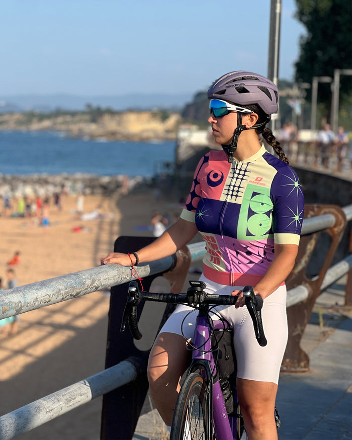 Los bloques de color llamativos están volviendo con fuerza a la ropa de ciclismo, especialmente entre los ciclistas más jóvenes y los entusiastas urbanos. Pastel Voyage captura esta tendencia con una dinámica fusión de lavanda, coral y morado intenso. La vibrante paleta logra un equilibrio entre la energía lúdica y el estilo moderno, mientras que la composición geométrica evoca movimiento y ritmo, evocando el espíritu de las rutas rápidas.