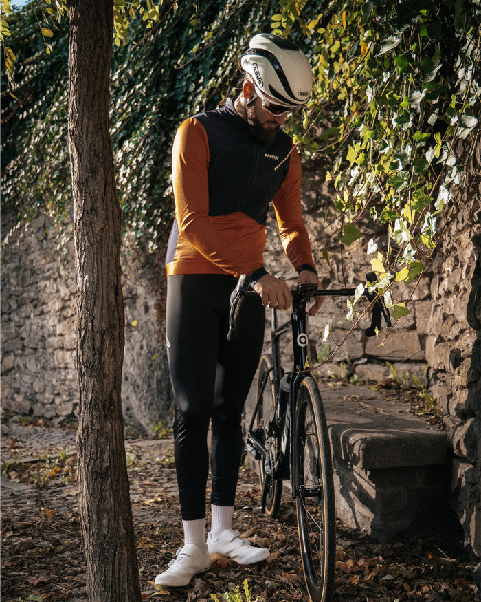 デュアルファブリック・パフォーマンスデザイン。フロントにはディープネイビーの4ウェイストレッチ織りナイロンを使用し、防風性と防水性を実現。その他の部分には軽量なオレンジのサーマルファブリックを使用し、保温性と通気性を確保。YKKダブルスライダージッパーと滑り止め加工の裾が冷気を遮断し、3+2ポケットシステムにはエナジージェルや必需品を収納できます。背面の反射ディテールが視認性を高め、Zephyrは秋冬のライドで多用途に活躍します。